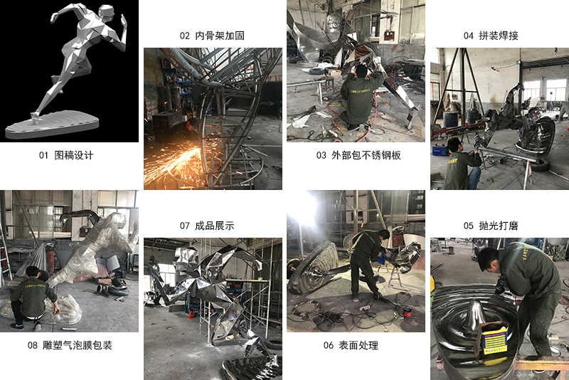 3、成型:焊接、打磨及喷漆。形体锻造正确后,就要依照作品要求把它们焊接到一起(有电焊和氩弧焊)。不锈钢抛光首先用砂轮片把制作作品的焊缝和多余的地方磨平,然后用软轮(布轮)进行抛制,抛光时作品涂上抛光膏增加润滑,使作品抛出来更光亮,从而给人一种良好的视觉美感。最后根据需求喷漆。