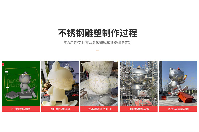 1、不锈钢:不锈耐酸钢简称不锈钢,它是由不锈钢和耐酸钢两大部分组成的,简言之,能抵抗大气腐蚀的钢叫不锈钢,而能抵抗化学介质腐蚀的钢叫耐酸钢。由于不锈钢有诸多的优越性,因此,很多的城市雕塑都是以它为材料。不锈钢要求雕塑本身简洁大方,形体感明显,且光影效果强烈,颜色的选择性最大。